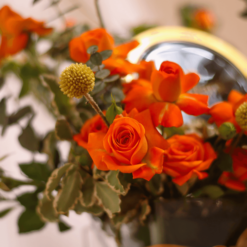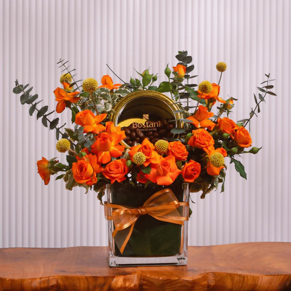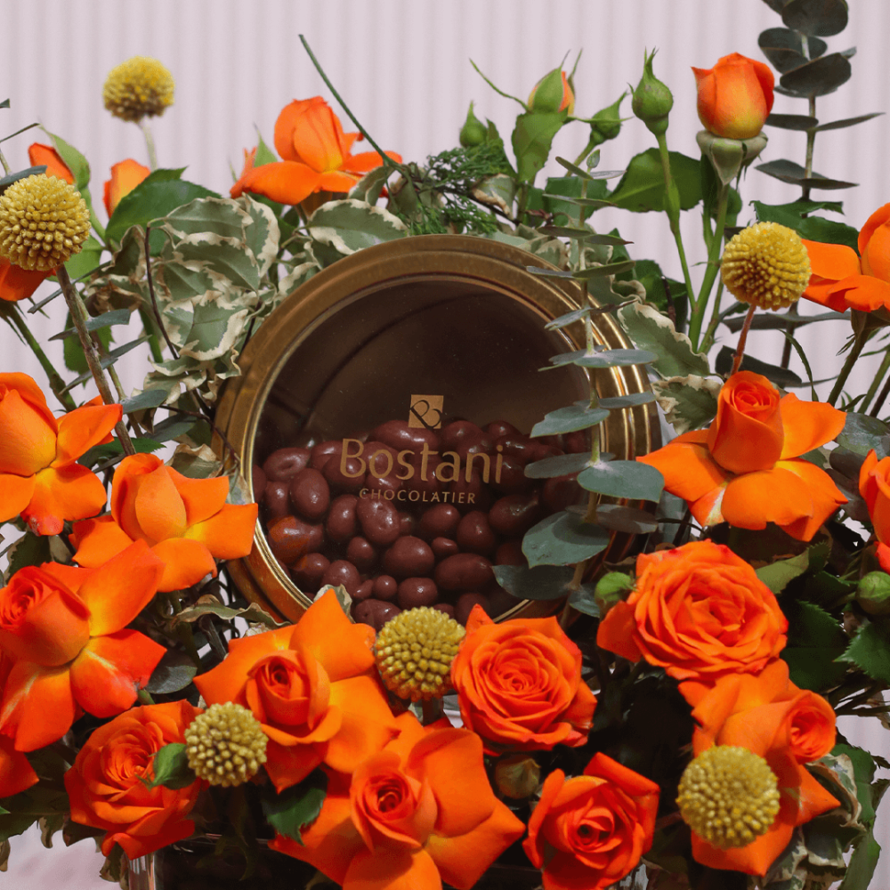 - يحتوي المنتج : على علبة شوكلاته يستاني دراجيه الفستق الحلبي بشوكلاته الحليب بوزن 200 جرام مع تنسيق ورد منوع من درجات الاورنج من البيبي جوري و اكسسوارات الورد